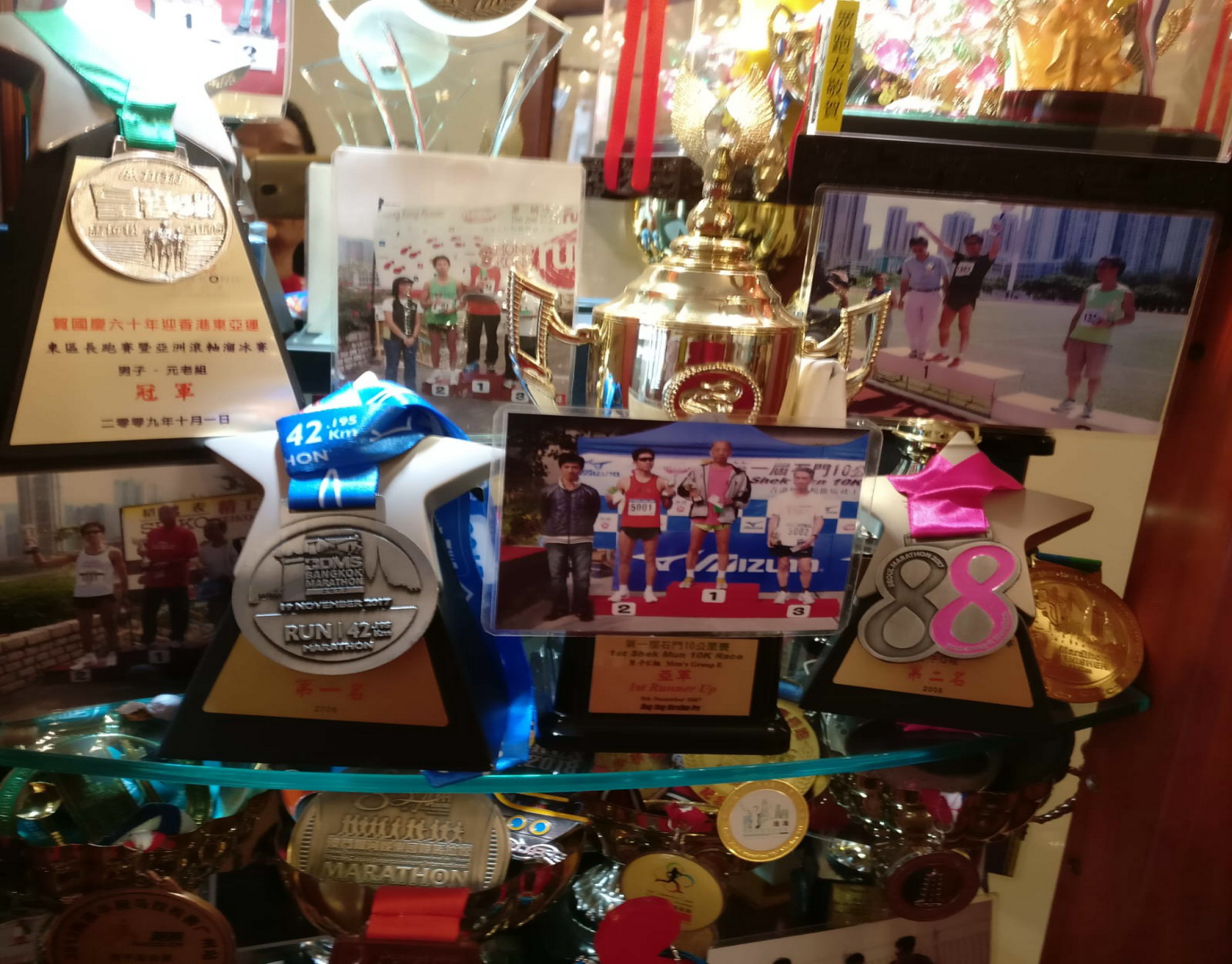 他說,自己對跑步最瘋狂的年代是在2007年至2008年,因當年他剛升上60歲組,所以每場比賽都會搏名次,結果他也如願,是比賽中上台領獎的常客,前輩周渭川跟他開玩笑,建議他準備大籮用來盛載獎盃才行,當年的確如是,何錦棠師兄攞獎攞到手軟。