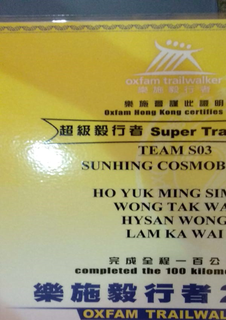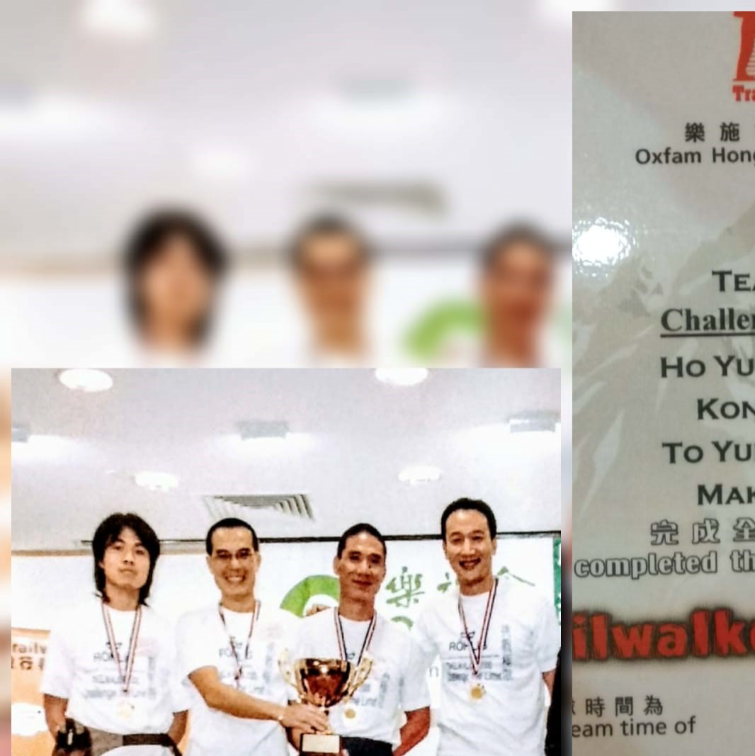 話說在2000年,Simon通過樂施會的配對,找到了其餘3位拍檔組隊參加毅行,其中一位是消防員,經過練習後,此位師兄表示Simon的體能是可以的,跑平路尚可以,但心肺和四頭肌未達標準,於是對他展開特訓。Simon記得當時在鳯凰山練習,一天內要上落鳯鳯山7次,如此練法他當然進步神速,當年的「毅行者」他們在下午出發,仍以17小時38分完成,獲得普通隊伍中的亞軍,也獲得了他參加毅行以來的第一隻獎盃。